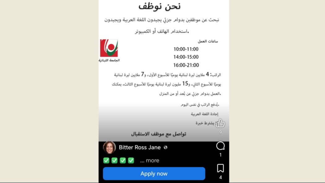 صدر عن رئاسة الجامعة اللبنانية البيان الآتي: "تنتشر على وسائل التواصل الاجتماعي وبعض المواقع الإلكترونية إعلانات باسم الجامعة اللبنانية (تستخدم لوغو الجامعة، وبعضُ عناوينها خارج لبنان) تدّعي تأمين (تجنيد) فرص عمل من بُعد. يهم رئاسة الجامعة اللبنانية الإشارة إلى أن هذه الإعلانات زائفة ولا صحة لها على الإطلاق، وتنبّه إلى وجوب الحذر من مُطلقيها وناشريها. وإذ تؤكد حقها في ملاحقة ومقاضاة مطلقي هذه الإعلانات، تلفت رئاسة الجامعة اللبنانية إلى أن أي إعلان بخصوص تأمين فرص عمل للطلاب أو الخريجين يتم نشره حصرًا على صفحات الجامعة الرسمية". |