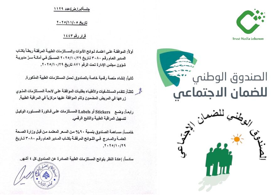 وافق مجلس ادارة الضمان على اعتماد لوائح الأدوات والمستلزمات الطبية الواردة في كتاب المدير العام للصندوق محمد كركي، ومساهمة الصندوق بنسبة 90% من السعر المعتمد من وزارة الصحة، على أن يصبح القرار نافذا فور مصادقتها من وزير العمل محمد حيدر. كذلك قرر إنشاء منصة رقمية خاصة بالصندوق تحمل المستلزمات الطبية المذكورة، على أن تتقدم المستشفيات والأطباء بطلبات الموافقة على لائحة المستلزمات المنوي زرعها في المريض المضمون وتتم الموافقة عليها مركزياً في المراقبة الطبية. وقرر ايضا إعادة النظر بلوائح المستلزمات الطبية الصادرة عن الصندوق كل 4 أشهر. وأوصى المجلس بوضع Stickers أو Labels المستلزمات على فاتورة المستورد الوكيل لتسهيل المراقبة الطبية والتتبع الرقمي.