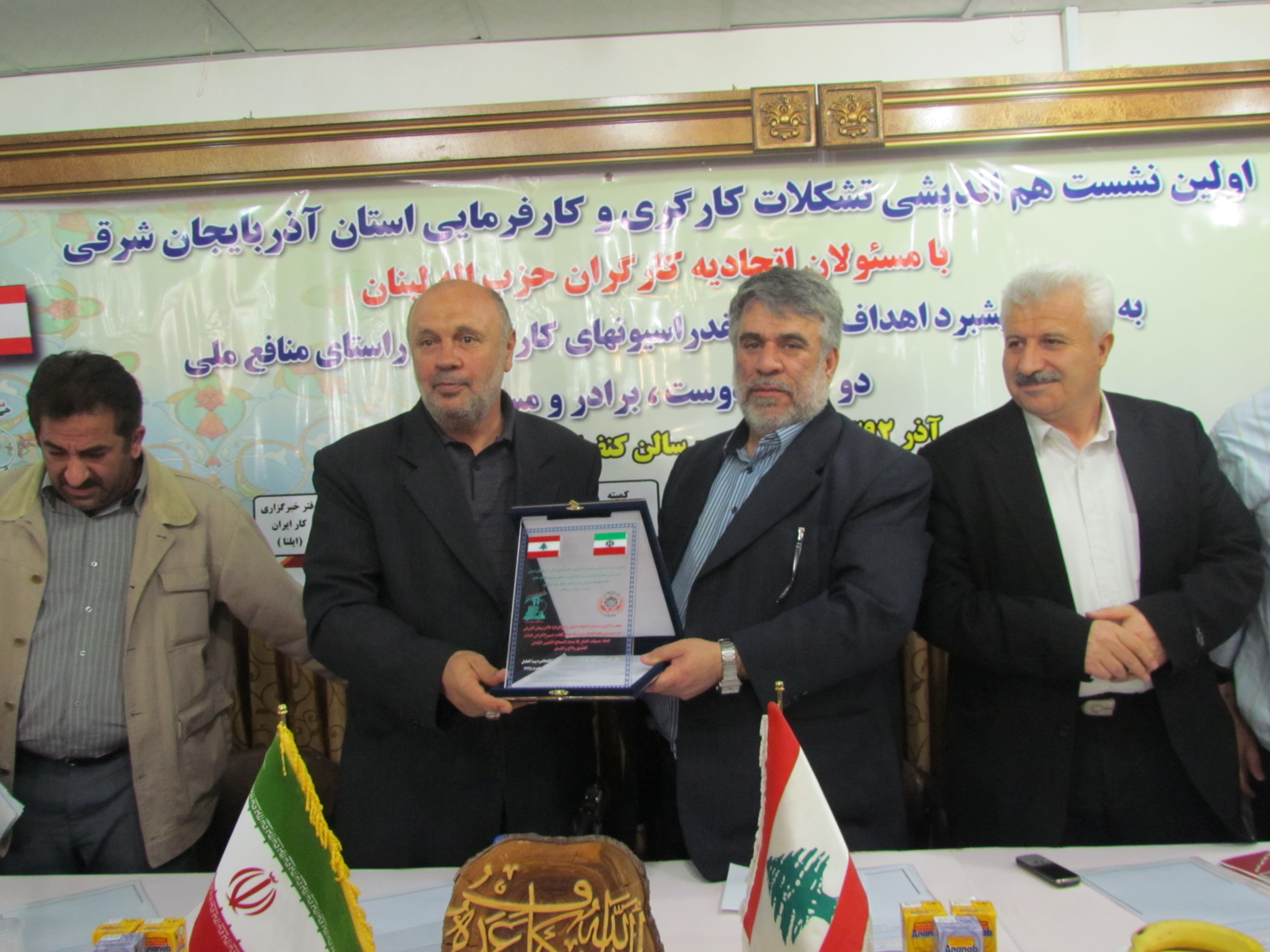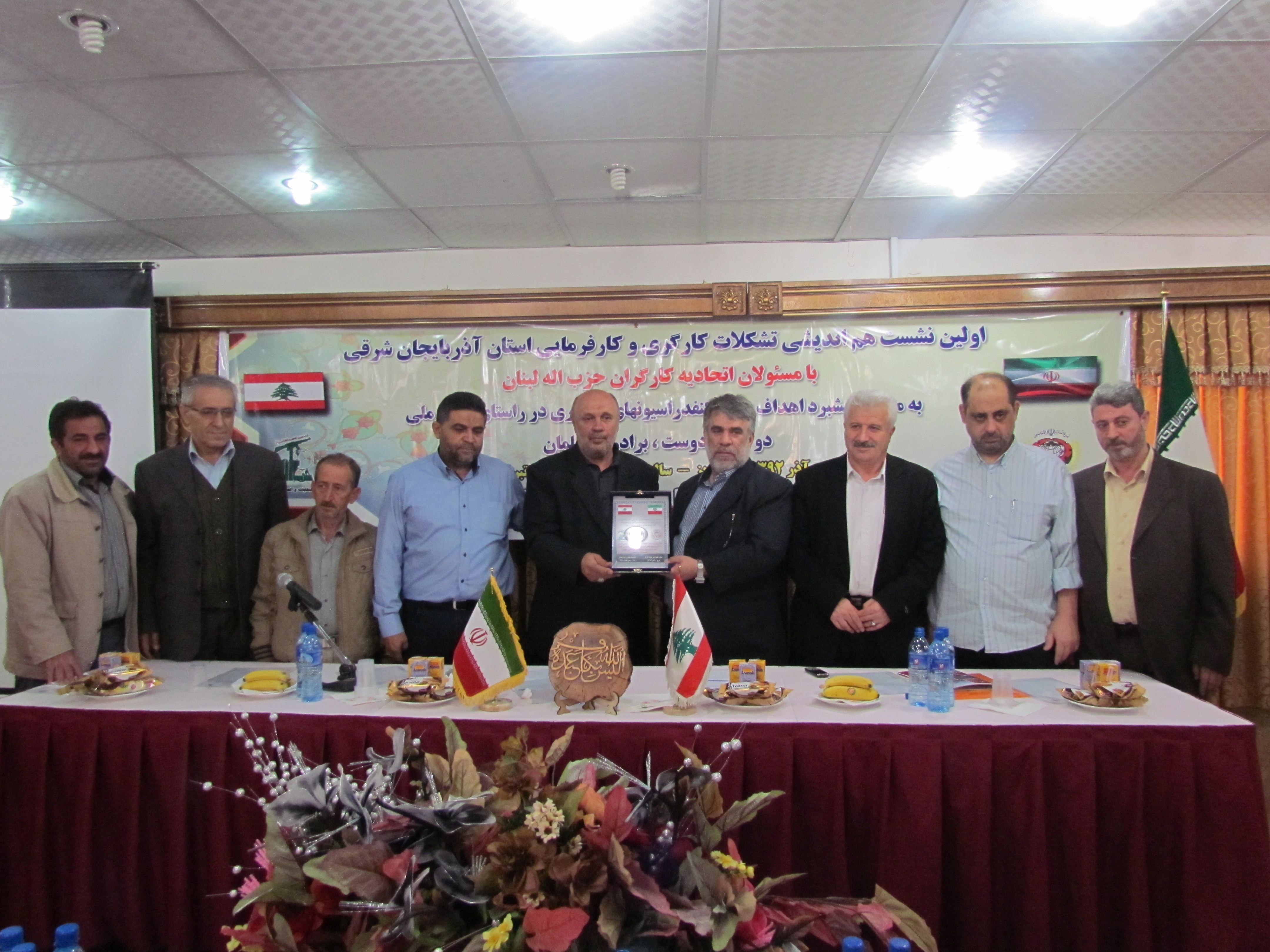 شارك وفد وحدة النقابات والعمال المركزية في حزب الله الذي يقوم بزيار للجمهوريةالاسلامية ، في جلسة عامة للهيئة الاجرائية ( التنفيذية ) لبيت العامل في تبريز عقدت بتاريخ 27-11-2013 ، حضرتها اللجان العمالي والمهنية واعضاء المجلس الاسلامية للعمل الاعضاء في بيت العامل والنشطاء افاعلين في محافظة آربيجان الشرقية وشارك في الجلسة مندوب أصحاب العمل في المحافظة السيد كاظم زادة . بداية ترحيب من مسؤول بيت العامل في اذربيجان الشرقية السيد صادق زادة ، وعرض لأهم الأنشطة التي يقوم بها بيت العامل في المحافظة وعلى المستوى العربي والدولي ضمن مشاركات بيت العامل المركزي ، تحدث مسؤول وحدة النقابات والعمال المركزية في حزب الله الحاج هاشم سلهب ، فأبدى سعادته بلقاء العمال الغيارى الذين يديرون عجلة الحياة في محافظة اقتصادية صناعية وثقافية من حافظات الجمهورية الاسلامية الايرانية المباركة ، وقال مخاطبا عمال محافظة اذربيجان " إن آمال الأمة الاسلامية معقودة عليكم في امانة حفظ الجمهورية الاسلامية ونظامها المبارك ، والسعي الدائم لتطوير امكاناتها وقدراتها والارتقاء بها ، ولا تتوقعوا أن يأتي أحد من الخارج ليؤدي هذه الأمانة عنكم للامام الحجة محمد بن الحسن عجل الله تعالى فرجه الشرف ، بل الصحيح أن الخارج دائما يحاول أن يعتدي عليكم ويصب مصائبه ، كما هو الواقع القائم مع امريكا والغرب المستكبر الذي فرض عليكم حصارا تعسفيا، ومقاطعة اقتصادية ظالمة ، فصمدتم وصبرتم وواجهتم بالعزم والارادة ، ووقفتم الى جانب سماحة الامام القائد ، والى جانب الحكومة الاسلامية في هذا البلد العزيز، وكان لكم ما اردتم وحققتم انتصارا باهرا وعزيزا في حقكم بالتكنولوجيا النووية ، لم تستطع امريكا ولا ربييتها اسرائيل أن تنكرانه، وتفرا من حسرته والمه ، فاثبتم أنكم قادرون وفعلتم ما تريدون ، وكل العالم يقول معكم اليوم أنكم بحق قادرون .