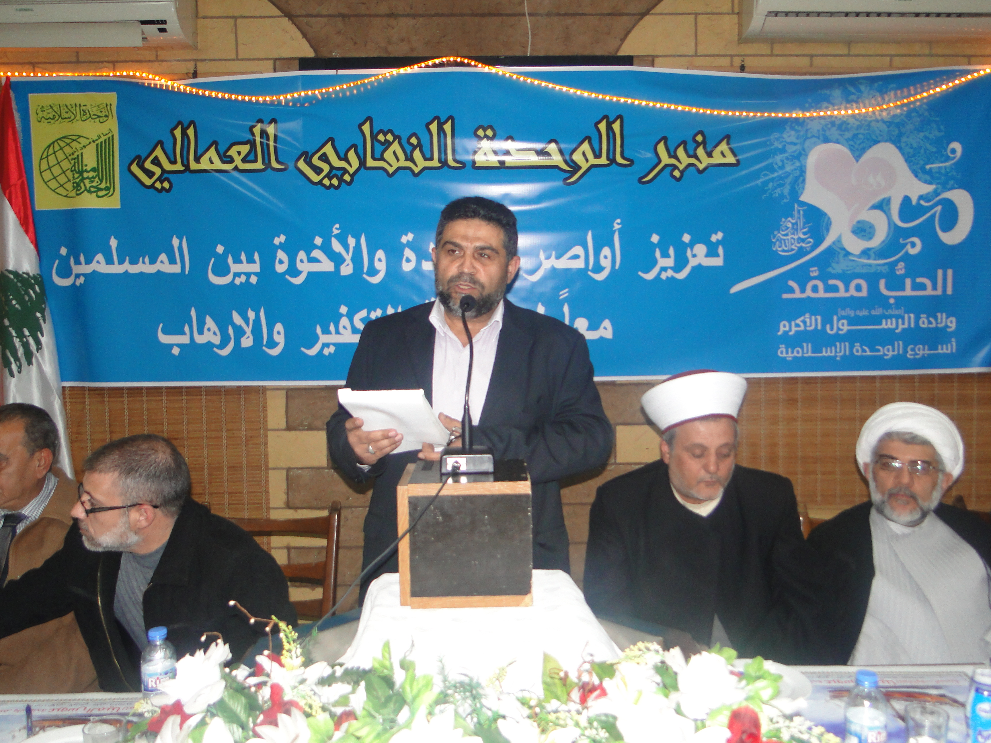 في أجواء الاحتفالات بذكرى المولد النبوي الشريف وأسبوع الوحدة الإسلامية ، اقام كل من إتحاد الوفاء لنقابات العمال والمستخدمين في لبنان، والاتحاد التضامني لنقابات العمال والمستخدمين في لبنان ، والاتحاد العام لنقابات عمال فلسطين –فرع لبنان,واتحاد النقابات العمالية والمهنية، وإتحاد الضياء لنقابات العمال والمستخدمين في بيروت ، أقاموا لقاءً تحت عنوان "منبر الوحدة النقابي العمالي- تعزيز أواصر الوحدة والأخوّة بين المسلمين"، " معا لمواجهة الارهاب والتكفيريين "، وذلك عصر يوم الأربعاء 22-1-2014 في مطعم عروس الميناء في الأوزاعي.حضره إضافة الى الجهات الداعية جمع من الوفود النقابية والعمالية تقدمها وفد تجمع العلماء المسلمين، ضم كلا من سماحة الشيخ حسين غبريس، وسماحة الشيخ إبراهيم البريدي، وشارك في الحفل كل من رئيس وأعضاء المكتب العمالي لحركة أمل،مسؤول وحدة النقابات في حزب الله الحاج هاشم سلهب وأعضاء من الوحدة ،مسؤول العمل النقابي في حركة الناصريين المستقلين "المرابطون" الأخ جهاد السمّاك ، نائب رئيس الاتحاد العمالي العام الحاج حسن فقيه،أمين عام الاتحاد العمالي العام سعد الدين حميدي صقر، رؤساء وأعضاء اتحادات النقل البري في لبنان،بسام طليس،عبد الأمير نجدي،عبد الله حمادة، ووفد موسع من الاتحاد العام لعمال فلسطين – فرع لبنان ، برئاسة أبو يوسف العدوي، القرآن الكريم اولا ، تلاه النشيد الوطني اللبناني ، ليتتالى المتحدثون على منبر الوحدة في ذكرى مولد نبي الرحمة والهدى والوحدة وأسبوع الوحدة الاسلامية ، فركز الجميع على المعاني القيّمة التي تحملها المناسبة للمسلمين وللعالمين أجمع ، منددين بالارهاب التكفيري الذي لا مكان له في القيم الاسلامية السمحاء .