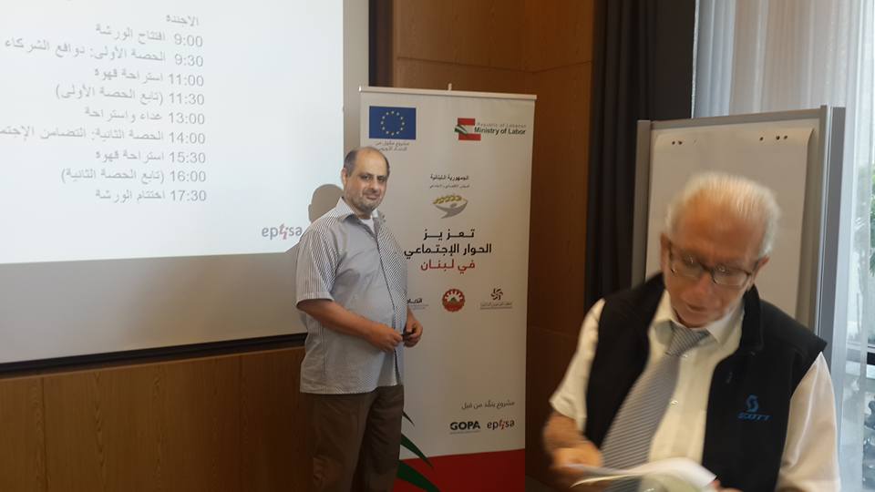 نظمت وزارة العمل بالتعاون مع الاتحاد الاوروبي ورشة تدريبية لتعزيز الحوار الاجتماعي بالتعاون مع الاتحاد الاوروبي وبتنظيم مؤسسة غوبا شارك فيها اطراف الانتاج الثلاثة في لبنان وقد قدم الورشة الدكتور غسان صليبي وشارك من اتحاد الوفاء الامين العام الحاج اسامة الخنسا . وستستمر الورشة لمدة ستة ايام . |