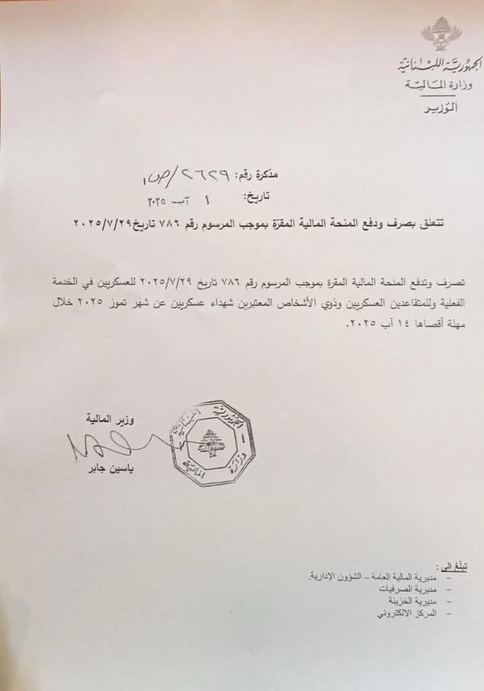 أصدرت وزارة المالية اللبنانية، اليوم، مذكرة رسمية تحمل الرقم 6269/ص1، أعلنت فيها عن المباشرة بصرف ودفع المنحة المالية المقرّرة بموجب المرسوم رقم 786 الصادر بتاريخ 29 تموز 2025، للعسكريين في الخدمة الفعلية، والمتقاعدين العسكريين، وذوي الأشخاص العسكريين المتوفين (شهداء عسكريين) عن شهر تموز 2025. وأشارت الوزارة إلى أن صرف المنحة سيتم خلال مهلة أقصاها 14 آب الجاري. وقد وقّع المذكرة وزير المالية الدكتور ياسين جابر، ووجّهها إلى مديرية المالية العامة – الشؤون الإدارية، ومديرية الصرفيات، ومديرية الخزينة، والمركز الإلكتروني، لاتخاذ الإجراءات اللازمة. |