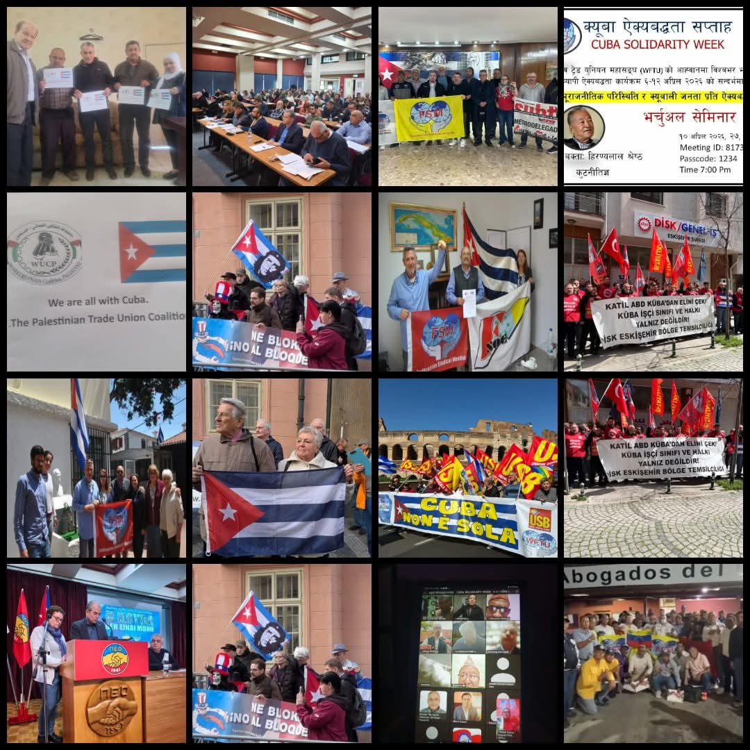 أطلق إتحاد النقابات العالمي (WFTU) أسبوعًا للتضامن مع الشعب الكوبي البطل خلال الفترة من 16 إلى 22 نيسان 2026. ومن خلال هذه الحملة، نظّم أعضاء الإتحاد من مختلف أنحاء العالم مبادرات تضامنية للتعبير عن دعمهم للشعب الكوبي بطرق عملية أيضًا، بما في ذلك جمع المواد الضرورية والأساسية، إضافة إلى تنظيم حملات تبرّع لدعم صمود الطبقة العاملة في كوبا. إن دعم وتضامن الحركة النقابية ذات التوجه الطبقي لا ينتهي بانتهاء هذه الحملة، بل سيواصل إتحاد النقابات العالمي وأعضاؤه تعزيز وتكثيف تضامنهم مع كوبا. |