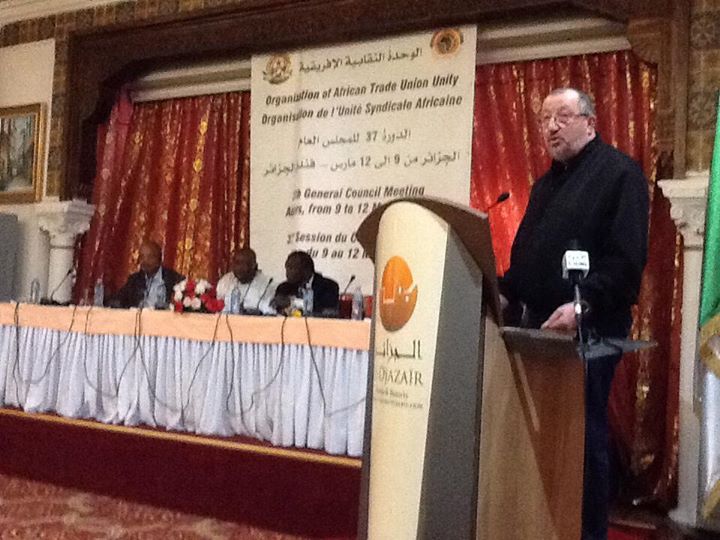 بدأت الثلاثاء 11 مارس 2014 اعمال المؤتمر النقابي الدولي الذي تنظمه منظمة الوحدة النقابية الافريقية ، باستضافة كريمة من الاتحاد العام للعمال الجزائريين ، بقاعة المؤتمرات بفندق الجزائر . بالعاصمة الجزائر .بدا المؤتمر بكلمة ترحيبية من قبل عبدالمجيد سيدي سعيد ، الامين العام للاتحاد العام للعمال الجزائريين . رحب فيها بالضيوف الذين حضروا للمشاركة في هذا المؤتمر من مختلف أنحاء العالم . ونحوه الى أهمية عقد هذا المؤتمر لخلق حركة تضامن دولي لمواجهة كافة الاستحقاقات . ولتصحيح أوضاع الحركة النقابية الدولية .تحدث بعده فرانسيس اتولي رئيس اتحاد عمال كينيا ، رئيس منظمة الوحدة النقابية الافريقية ، الذي أوضح من جانبه آليات عمل المؤتمر ، وركز على أهمية مناقشة قضايا المؤتمر بهدوء وعمق لأننا في حاجة للوصول الى قرارات هامة تخدم الحركة النقابية الدولية ، قام بعدها آوي لاكيمفا الامين العام لمنظمة الوحدة النقابية الافريقية بتقديم مداخلته المطولة حول الأوضاع النقابية في افريقيا والتحديات الماثلة أمامها ، وأهمية التضامن النقابي الدولي لدعم الجهود المشتركة لتمتين الموقف النقابي الدولي وخلق آليات مبتكرة للتعاون النقابي الدولي