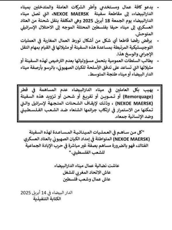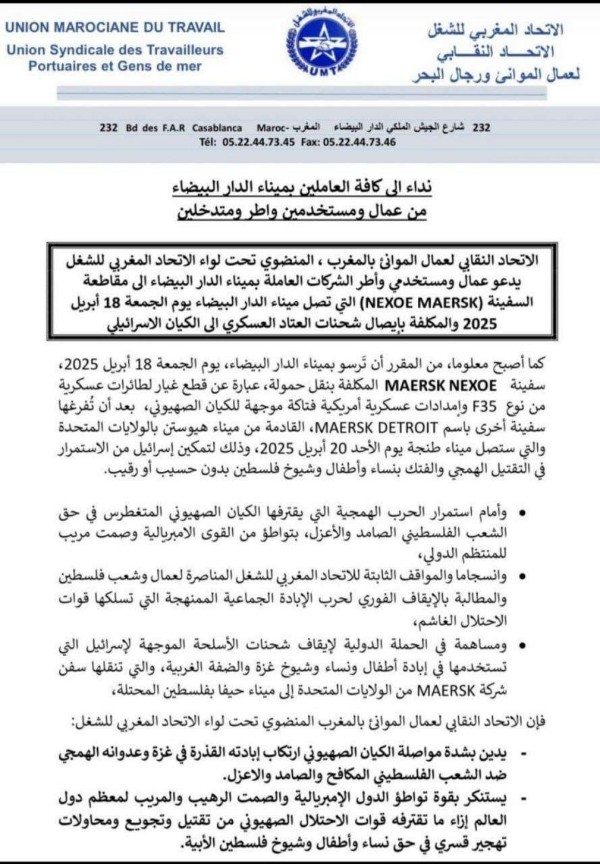الأربعاء ١٦ نيسان ٢٠٢٥ دعت نقابات عمالية في موانئ فرنسا والمغرب إلى مقاطعة سفينة شحن تابعة لشركة “ميرسك”، تحمل أسلحة أمريكية في طريقها إلى ميناء حيفا الإسرائيلي، رفضاً لجرائم الإبادة الجماعية التي يرتكبها الجيش الإسرائيلي بحق أبناء الشعب الفلسطيني. وكشف تقرير نشرته صحيفة “لامارسيلايسي” الفرنسية، اليوم الثلاثاء، رصده وترجمه موقع “يمن إيكو”، عن دعوات أطلقتها حركة “مقاطعة إسرائيل وسحب الاستثمارات وفرض العقوبات عليها في فرنسا”، لمقاطعة سفينة يشتبه بأنها تحمل أجزاء طائرات حربية لإسرائيل. ووفقاً للتقرير، حثت حركة المقاطعة، عمال الموانئ الفرنسية “على رفض هذا التواطؤ، والامتناع عن القيام بأي عملية تتعلق بنقل المعدات العسكرية إلى إسرائيل “. كما نددت الحركة، الجمعة الماضية، بتوقف السفينة “ميرسك نيكسو” في ميناء فوس سور مير الفرنسي، في طريقها إلى ميناء طنجة المغربي، مؤكدة أن السفينة تحمل مكونات لطائرات إف-35 من شركة لوكهيد مارتن، مخصصة للجيش الإسرائيلي، قبل مواصلة رحلتها إلى ميناء حيفا في إسرائيل. وأوضح التقرير أن اتحاد عمال الموانئ وموظفي المناولة في موانئ خليج فوس الفرنسي، أكدوا رفضهم السماح للسفينة بالعودة إلى ميناء فوس سور مير الفرنسي، إذا تبين أنها تحمل أسلحة لإسرائيل، وأكد عمال الموانئ أنهم “يناضلون من أجل السلام ووضع حد للإبادة الجماعية التي ترتكبها الحكومة الإسرائيلية”. وفي المغرب، دعا الاتحاد النقابي لعمال الموانئ، في بيان تداولته وسائل إعلام مغربية، واطلع عليه “يمن إيكو”، كافة العاملين بميناء الدار البيضاء الى مقاطعة السفينة “ميرسك نيكسو” التي تصل ميناء الدار البيضاء يوم الجمعة المقبل “والمكلفة بإيصال شحنات العتاد العسكري إلى الكيان الإسرائيلي”. وأشار البيان إلى أن السفينة مكلفة بنقل حمولة، عبارة عن قطع غيار لطائرات عسكرية من نوع F35 وإمدادات عسكرية أمريكية فتاكة موجهة للكيان الصهيوني، بعد أن تفرغها سفينة أخرى باسم “ميرسك ديترويت” قادمة من ميناء هيوستن بالولايات المتحدة والتي ستصل ميناء طنجة يوم الأحد 20 أبريل 2025، “وذلك لتمكين إسرائيل من الاستمرار في التقتيل الهمجي والفتك بنساء وأطفال وشيوخ فلسطين بدون حسيب أو رقيب”. وأكد اتحاد العمال موقفه الثابت لمناصرة الشعب الفلسطيني، ومساهمته في الحملة الدولية “لإيقاف شحنات الأسلحة الموجهة لإسرائيل والتي تنقلها سفن شركة MAERSK من الولايات المتحدة إلى ميناء حيفا بفلسطين المحتلة”. وأدان بشدة “مواصلة الكيان الصهيوني ارتكاب إبادته القذرة في غزة وعدوانه الهمجي ضد الشعب الفلسطيني المكافح والصامد والاعزل”، مستنكراً الصمت الدولي إزاء الجرائم الإسرائيلية. ورفض الاتحاد العمالي “أي شكل من أشكال تورط العمال المغاربة في العمليات اللوجيستيكية المرتبطة بمساعدة هذه السفينة أو مثيلاتها في القيام بمهام النقل الإجرامي والوسخ هذا”، حسب ما جاء في البيان. وطالب السلطات العمومية “بتحمل مسؤولياتها بعدم الترخيص لهذه السفينة أو مثيلاتها التي تساعد على تدفق الأسلحة للكيان الصهيوني، بالرسو في أرصفة ميناء الدار البيضاء أو ميناء طنجة المتوسط”. كما أهاب بكل العاملين في ميناء الدار البيضاء “عدم المساهمة في قطر أو تموين أو تفريغ أو شحن أو تزويد هذه السفينة”، مؤكداً أن “كل من ساهم في العمليات المينائية المساعدة لهذه السفينة المتواطئة في إمداد الكيان الصهيوني بالعتاد العسكري الفتاك، فهو بالضرورة مساهم بصفة غير مباشرة في حرب الإبادة الجماعية للشعب الفلسطيني”.