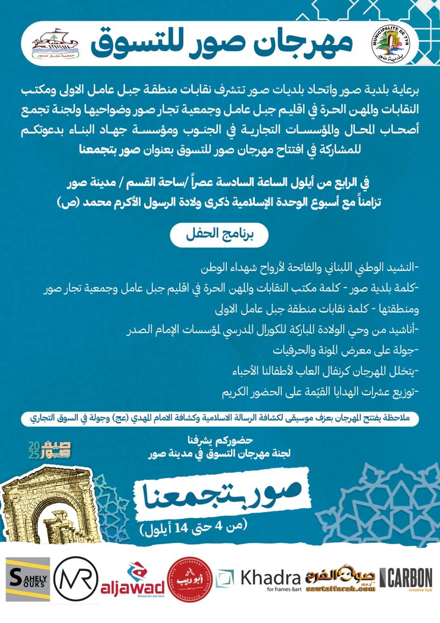 برعاية بلدية صور واتحاد بلديات صور، وبمشاركة نقابات منطقة جبل عامل الأولى، مكتب النقابات والمهن الحرة في إقليم جبل عامل، جمعية تجار صور وضواحيها، لجنة تجمع أصحاب المحال والمؤسسات التجارية في الجنوب، ومؤسسة جهاد البناء، تنطلق فعاليات "مهرجان صور للتسوق" تحت شعار "صور بتجمعنا"، وذلك يوم الأحد في الرابع من أيلول عند الساعة السادسة مساءً في ساحة القسم – مدينة صور، ويستمر المهرجان حتى الرابع عشر من أيلول، تزامناً مع أسبوع الوحدة الإسلامية وذكرى ولادة الرسول الأكرم محمد (صلى الله عليه وآله وسلم). برنامج الافتتاح: - عزف موسيقي لكشافة الرسالة الإسلامية وكشافة الإمام المهدي (عج)، يتبعه جولة في السوق التجاري. - النشيد الوطني اللبناني وقراءة الفاتحة لأرواح شهداء الوطن. - كلمات رسمية لكل من: بلدية صور، نقابات منطقة جبل عامل، المكتب النقابي والمهن الحرة في إقليم جبل عامل، وجمعية تجار صور وضواحيها. - أناشيد من وحي الولادة المباركة يقدمها الكورال المدرسي لمؤسسات الإمام الصدر. - جولة على معرض المونة والحرفيات. فعاليات المهرجان: يتخلل المهرجان على مدى أيامه: - كرنفال ألعاب للأطفال. - توزيع عشرات الهدايا القيّمة على الحضور. - معرض للمنتجات المحلية والحرفيات دعماً للأسر والمؤسسات المنتجة. ويهدف المهرجان إلى تنشيط الحركة الاقتصادية في صور ومنطقتها، وإضفاء أجواء احتفالية جامعة لأبناء المدينة وزوارها. |