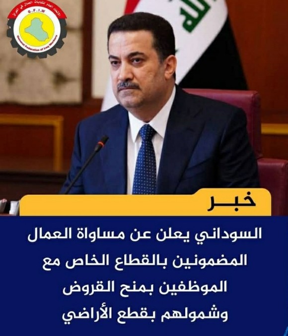 بغداد – أعلن رئيس الوزراء العراقي، محمد شياع السوداني، عن خطوة جديدة تهدف إلى تحقيق العدالة الاجتماعية بين شرائح المجتمع، حيث أكد على مساواة العمال المضمونين في القطاع الخاص بموظفي الدولة من حيث الاستفادة من القروض وشمولهم ببرامج توزيع قطع الأراضي السكنية. وأوضح السوداني خلال اجتماع رسمي أن هذه المبادرة تأتي ضمن جهود الحكومة لدعم شريحة العمال وتحقيق التوازن في الامتيازات بين العاملين في القطاعين العام والخاص، مشيرًا إلى أن هذه الخطوة ستشجع المزيد من المواطنين على الانخراط في سوق العمل الخاص وتُسهم في تقليل الضغط على الوظائف الحكومية. وتأتي هذه الخطوة الحكومية بمناسبة عيد العمال العالمي في الأول من أيار الخالد، كبشارة خير لعمالنا المضمونين، وذلك لمساواتهم بموظفي الدولة، وإقرار حقوقهم التي طال انتظارها. وفي هذا السياق، عبّر الاتحاد العام لنقابات العمال في العراق عن ترحيبه بهذه الخطوة، مؤكدًا أن الاتحاد يأمل بتعجيل تنفيذ هذه الإجراءات على أرض الواقع، والعمل على تعزيز الرؤية نحو بيئة عمل تضمن العدالة والكرامة وتخدم العامل العراقي، الذي يعد ركيزة أساسية في بناء الاقتصاد الوطني. وأضاف الاتحاد أن تحقيق هذه الوعود سيسهم في رفع معنويات العمال وتحفيزهم على الاستقرار في أعمالهم، مطالبًا بمتابعة مستمرة لتنفيذ القرار والتأكيد على شموليته لكافة الفئات المشمولة بالضمان الاجتماعي في القطاع الخاص. |