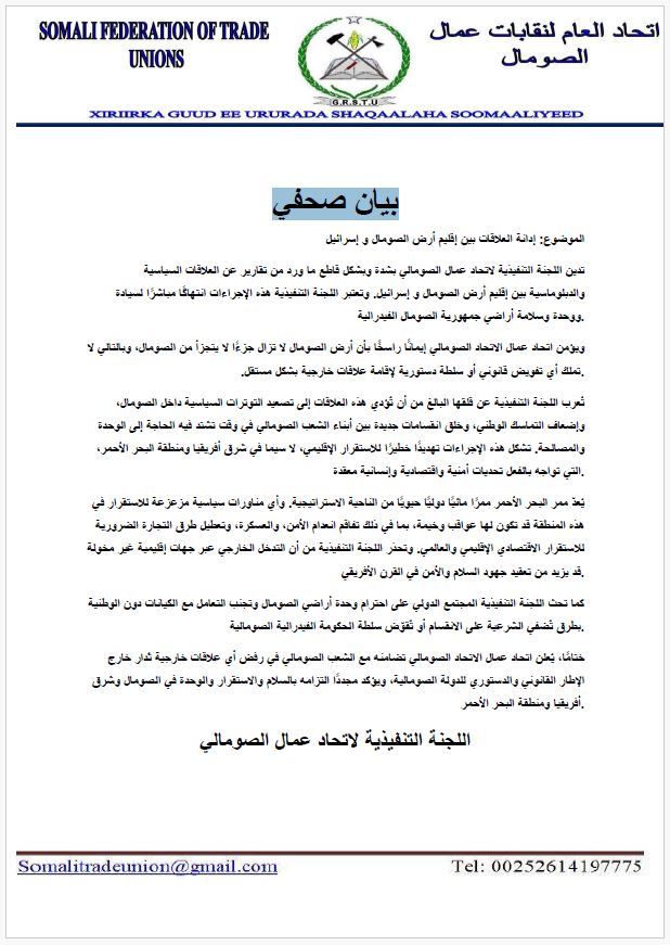أصدر اتحاد عمال الصومال، عبر لجنته التنفيذية، بياناً صحفياً دان فيه بشدة ما ورد في بعض التقارير حول إدارة علاقات سياسية ودبلوماسية بين إقليم أرض الصومال والاحتلال الإسرائيلي، معتبراً أن هذه الخطوات تمثّل انتهاكاً مباشراً لسيادة ووحدة أراضي جمهورية الصومال الفيدرالية. وأكد الاتحاد أن إقليم أرض الصومال لا يزال جزءاً لا يتجزأ من الدولة الصومالية، ولا يملك أي تفويض قانوني أو دستوري لإقامة علاقات خارجية مستقلة، مشدداً على أن مثل هذه الممارسات تشكّل تجاوزاً خطيراً على الشرعية الوطنية. وحذّرت اللجنة التنفيذية من أن هذه العلاقات قد تؤدي إلى تصعيد التوترات السياسية داخل الصومال، وإضعاف التماسك الوطني، وخلق انقسامات جديدة بين أبناء الشعب الصومالي في مرحلة دقيقة تتطلب تعزيز الوحدة والمصالحة. وأشار البيان إلى أن هذه التطورات تمثّل تهديداً للاستقرار الإقليمي، لا سيما في منطقة شرق أفريقيا والبحر الأحمر، التي تواجه أساساً تحديات أمنية واقتصادية وإنسانية معقّدة. كما شدّد على الأهمية الاستراتيجية لممر البحر الأحمر للتجارة العالمية، محذّراً من أن أي مغامرات سياسية غير محسوبة قد تنعكس سلباً على الأمن والاستقرار الإقليمي والدولي. كما دعا اتحاد عمال الصومال المجتمع الدولي إلى احترام وحدة وسيادة الأراضي الصومالية، وعدم التعامل مع كيانات غير وطنية بطرق تكرّس الانقسام أو تقوّض سلطة الحكومة الفيدرالية الشرعية. وختم الاتحاد بيانه بالتأكيد على وقوفه إلى جانب الشعب الصومالي في رفض أي علاقات خارجية تُقام خارج الإطار القانوني والدستوري للدولة، مجدداً التزامه بدعم السلام والاستقرار والوحدة الوطنية في الصومال وعموم منطقة شرق أفريقيا والبحر الأحمر. اللجنة التنفيذية لاتحاد عمال الصومال