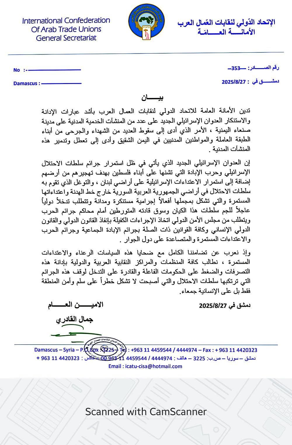 أصدرت الأمانة العامة للاتحاد الدولي لنقابات العمال العرب بيانًا رسميًا أدانت فيه بأشد العبارات العدوان الإسرائيلي الجديد على عدد من المنشآت الخدمية المدنية في مدينة صنعاء اليمنية، والذي أسفر عن سقوط العديد من الشهداء والجرحى من أبناء الطبقة العاملة والمواطنين المدنيين، بالإضافة إلى تدمير وتعطيل هذه المنشآت الحيوية. وأكد الاتحاد في بيانه أن هذا العدوان يأتي في ظل استمرار جرائم سلطات الاحتلال الإسرائيلي وحرب الإبادة التي تشنها على أبناء فلسطين بهدف تهجيرهم من أرضهم، واستمرار الاعتداءات على أراضي لبنان، والتوغل في الأراضي السورية خارج خط الهدنة، معتبرًا أن جميع هذه الأفعال تشكل أعمالًا إجرامية مستنكرة ومدانة، وتتطلب تدخلًا دوليًا عاجلًا لوقفها ومساءلة قادة الكيان الإسرائيلي أمام محاكم جرائم الحرب. وشدد البيان على ضرورة أن يتخذ مجلس الأمن الدولي الإجراءات اللازمة لإنفاذ القانون الدولي، والقانون الدولي الإنساني، وكل القوانين ذات الصلة بجرائم الإبادة الجماعية وجرائم الحرب، بما يشمل الاعتداءات المستمرة والمتصاعدة على دول الجوار. وأعرب الاتحاد عن تضامنه الكامل مع ضحايا هذه السياسات العدوانية، ودعا كافة المنظمات والمراكز النقابية العربية والدولية إلى إدانة هذه التصرفات والضغط على الحكومات القادرة على التدخل لوقف هذه الجرائم، التي باتت تشكل خطرًا ليس فقط على أمن المنطقة وسلامتها، بل على الإنسانية جمعاء. صدر البيان عن الأمانة العامة للاتحاد الدولي لنقابات العمال العرب في دمشق، ووقعه الأمين العام جمال القادري. خاص موقع اتحاد الوفاء |