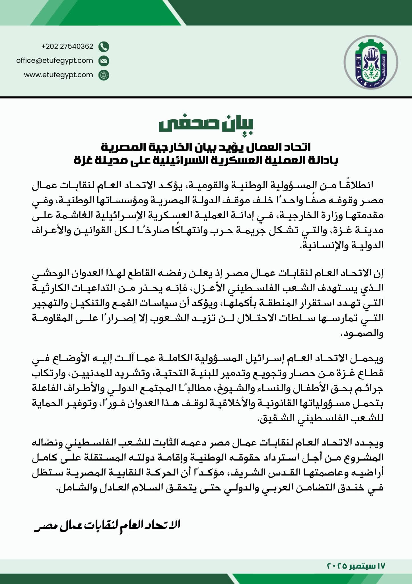 أعلن الاتحاد العام لنقابات عمال مصر تضامنه الكامل مع الموقف الرسمي المصري، مؤكدًا تأييده لبيان وزارة الخارجية المصرية الذي أدان العملية العسكرية الإسرائيلية على مدينة غزة، واعتبرها جريمة حرب وانتهاكًا صارخًا لكل القوانين والأعراف الدولية والإنسانية. وأوضح الاتحاد في بيان صحفي، أن العدوان الوحشي على غزة يمثّل جريمة بشعة تهدد حياة المدنيين وتفاقم المعاناة الإنسانية، مشددًا على أن ممارسات القمع والتنكيل والتهجير التي ينفذها الاحتلال لن تزيد الشعوب إلا إصرارًا على المقاومة والصمود. وحمّل الاتحاد إسرائيل المسؤولية الكاملة عن تدهور الأوضاع في القطاع، من حصار وتجويع وتدمير للبنية التحتية وتشريد للمدنيين، مطالبًا المجتمع الدولي والأطراف الفاعلة بتحمل مسؤولياتهم القانونية والأخلاقية لوقف هذا العدوان وتوفير الحماية للشعب الفلسطيني. كما جدّد الاتحاد العام لنقابات عمال مصر موقفه الثابت الداعم للشعب الفلسطيني ونضاله المشروع من أجل استرداد حقوقه الوطنية وإقامة دولته المستقلة على كامل أراضيه وعاصمتها القدس الشريف، مؤكدًا أن الحركة النقابية المصرية ستظل في خندق التضامن العربي والدولي حتى يتحقق السلام العادل والشامل. |
