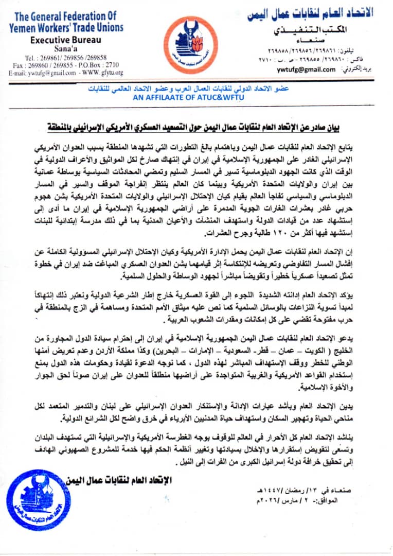 أدان الاتحاد العام لنقابات عمال اليمن التصعيد العسكري الأميركي – الإسرائيلي في المنطقة، محمّلًا الإدارة الأميركية وكيان الاحتلال الإسرائيلي المسؤولية الكاملة عن تداعيات هذا العدوان وانعكاساته الخطيرة على الأمن والاستقرار الإقليمي. وفي بيان صادر عن المكتب التنفيذي للاتحاد في صنعاء، عبّر الاتحاد عن متابعته بقلق بالغ للتطورات المتسارعة التي تشهدها المنطقة نتيجة العدوان الأميركي الإسرائيلي على الجمهورية الإسلامية في إيران، معتبرًا أن هذا الهجوم يشكّل انتهاكًا صارخًا لكل المواثيق والأعراف الدولية، ويأتي في وقت كانت فيه الجهود الدبلوماسية تسير نحو مسار تفاوضي لمعالجة الخلافات بين إيران والولايات المتحدة. وأشار البيان إلى أن العالم كان يترقب انفراجًا في المسار السياسي والدبلوماسي، غير أن الاحتلال الإسرائيلي والولايات المتحدة فاجآ المجتمع الدولي بشنّ هجوم عسكري واسع عبر مئات الغارات الجوية المدمرة على الأراضي الإيرانية، ما أدى إلى سقوط عدد من القيادات واستهداف منشآت مدنية وأعيان عامة، من بينها مدرسة ابتدائية للبنات، أسفر القصف عنها عن استشهاد أكثر من 120 طالبة وجرح العشرات. واعتبر الاتحاد أن اللجوء إلى القوة العسكرية خارج إطار الشرعية الدولية يمثل انتهاكًا لمبدأ تسوية النزاعات بالوسائل السلمية المنصوص عليه في ميثاق الأمم المتحدة، كما أنه يهدد بدفع المنطقة نحو مزيد من التوتر والتصعيد وربما نحو حرب مفتوحة قد تطال تداعياتها مختلف شعوب المنطقة. وأكد الاتحاد العام لنقابات عمال اليمن رفضه المطلق لهذه السياسات العدوانية، محذرًا من مخاطر استمرار النهج القائم على استخدام القوة وفرض الوقائع بالقوة العسكرية، لما يحمله ذلك من تهديد مباشر للسلم الإقليمي والدولي. كما دعا الاتحاد الدول العربية والإسلامية، ولا سيما دول الخليج (الكويت، عمان، قطر، السعودية، الإمارات والبحرين)، إضافة إلى المملكة الأردنية الهاشمية، إلى احترام سيادة الدول وعدم تعريض أمنها الوطني للخطر، مطالبًا حكومات هذه الدول بعدم السماح باستخدام أراضيها أو قواعدها العسكرية منطلقًا لأي عدوان على إيران. وجدد البيان إدانته الشديدة للعدوان الإسرائيلي على لبنان، ولما يرافقه من استهداف للمدنيين وتدمير للبنى التحتية وتهجير للسكان، معتبرًا أن هذه الممارسات تمثل خرقًا فاضحًا للقوانين الدولية والإنسانية. وفي ختام بيانه، ناشد الاتحاد العام لنقابات عمال اليمن أحرار العالم والقوى الحية الوقوف في وجه الغطرسة الأميركية والإسرائيلية، والعمل على حماية سيادة الدول واستقرارها، ومنع أي محاولات لفرض مشاريع الهيمنة أو تغيير الأنظمة بما يخدم المشروع الصهيوني الهادف إلى تحقيق مقولة “إسرائيل الكبرى من الفرات إلى النيل”. صدر في صنعاء بتاريخ 13 رمضان 1447هـ الموافق 2 آذار/مارس 2026.