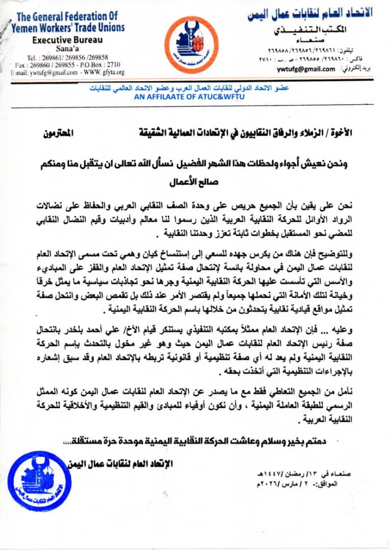 أكد الاتحاد العام لنقابات عمال اليمن تمسكه بوحدة الصف النقابي العربي والحفاظ على القيم والمبادئ التي قامت عليها الحركة النقابية، محذرًا من محاولات انتحال صفته أو التحدث باسمه من قبل جهات أو أشخاص لا يملكون أي صفة تنظيمية أو قانونية تخولهم ذلك. وفي رسالة موجّهة إلى الاتحادات العمالية الشقيقة، شدد الاتحاد على حرصه الدائم على تعزيز وحدة الحركة النقابية العربية وصون نضالات الرواد الأوائل الذين أسسوا تقاليد العمل النقابي ورسخوا قيم التضامن والعمل المشترك من أجل الدفاع عن حقوق العمال ومصالحهم. وأوضح البيان أن هناك جهات تسعى إلى استنساخ كيانات موازية تحت مسمى الاتحاد العام لنقابات عمال اليمن، في محاولة لانتحال صفة تمثيل الاتحاد العام والقفز على المبادئ التي قامت عليها الحركة النقابية اليمنية، معتبرًا أن هذه المحاولات تمثل خرقًا للأعراف النقابية وخيانة للأمانة التي يتحملها النقابيون في الدفاع عن وحدة العمل النقابي. وفي هذا السياق، استنكر الاتحاد العام، ممثلًا بمكتبه التنفيذي، قيام المدعو علي أحمد بخدر بانتحال صفة رئيس الاتحاد العام لنقابات عمال اليمن، مؤكدًا أنه لا يحمل أي صفة تنظيمية أو قانونية تخوّله التحدث باسم الاتحاد أو الحركة النقابية اليمنية، بعد أن سبق أن اتُخذت بحقه الإجراءات التنظيمية اللازمة. ودعا الاتحاد الاتحادات العمالية الشقيقة إلى التعاطي حصراً مع البيانات والمواقف الصادرة رسميًا عن الاتحاد العام لنقابات عمال اليمن بصفته الممثل الشرعي للطبقة العاملة اليمنية، مشددًا على ضرورة الالتزام بالمبادئ التنظيمية والقيم الأخلاقية التي تحكم العمل النقابي العربي. وختم الاتحاد بيانه بالتأكيد على أهمية الحفاظ على وحدة الحركة النقابية اليمنية واستقلاليتها، بما يعزز دورها في الدفاع عن حقوق العمال وخدمة قضاياهم، متمنيًا دوام التقدم والازدهار للحركة النقابية العربية. صدر في صنعاء بتاريخ 13 رمضان 1447هـ الموافق 2 آذار/مارس 2026.