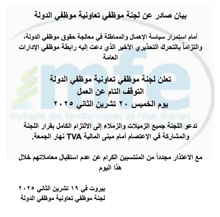 ردّاً على ما وصفته لجنة موظفي تعاونية موظفي الدولة بـ"سياسة الإهمال والمماطلة" في معالجة حقوق العاملين في الإدارات العامة، وفي ظل التحرك التحذيري الذي أطلقته رابطة موظفي الإدارة العامة، أعلنت اللجنة التوقف التام عن العمل يوم غدٍ الخميس الواقع في 20 تشرين الثاني 2025. ودعت اللجنة جميع الزميلات والزملاء إلى الالتزام الكامل بقرار الإضراب والمشاركة في الاعتصام الذي سيقام أمام مبنى المالية – TVA يوم الجمعة، تأكيداً على وحدة الموقف وضرورة الضغط لتحقيق المطالب المعلّقة منذ أشهر. كما اعتذرت اللجنة من المنتسبين عن عدم استقبال معاملاتهم طوال اليوم، مؤكدة أنّ الخطوة تأتي في إطار الدفاع عن حقوق الموظفين وصون الحدّ الأدنى من مقومات عملهم. صادر عن لجنة موظفي تعاونية موظفي الدولة. خاص موقع اتحاد الوفاء |